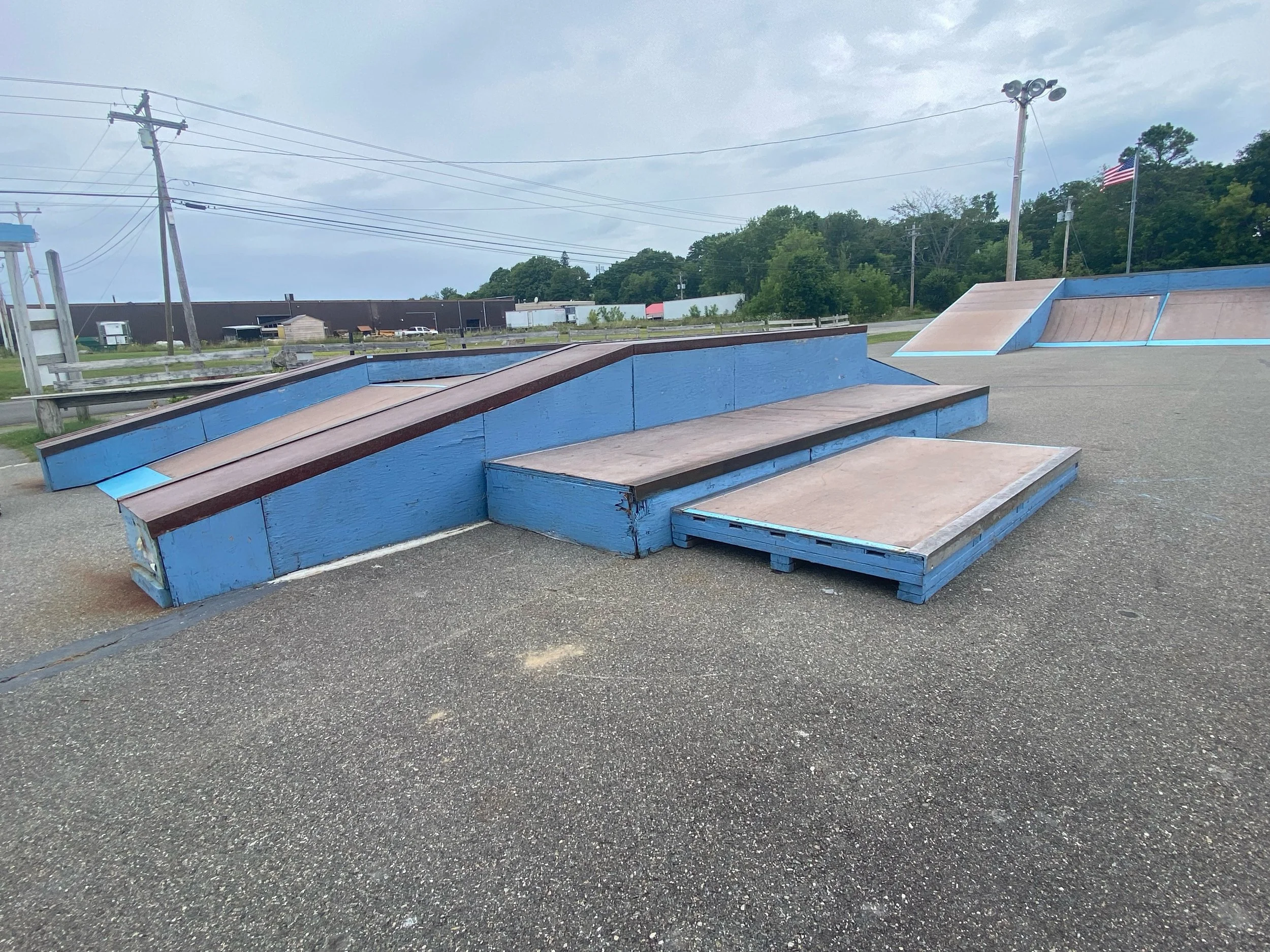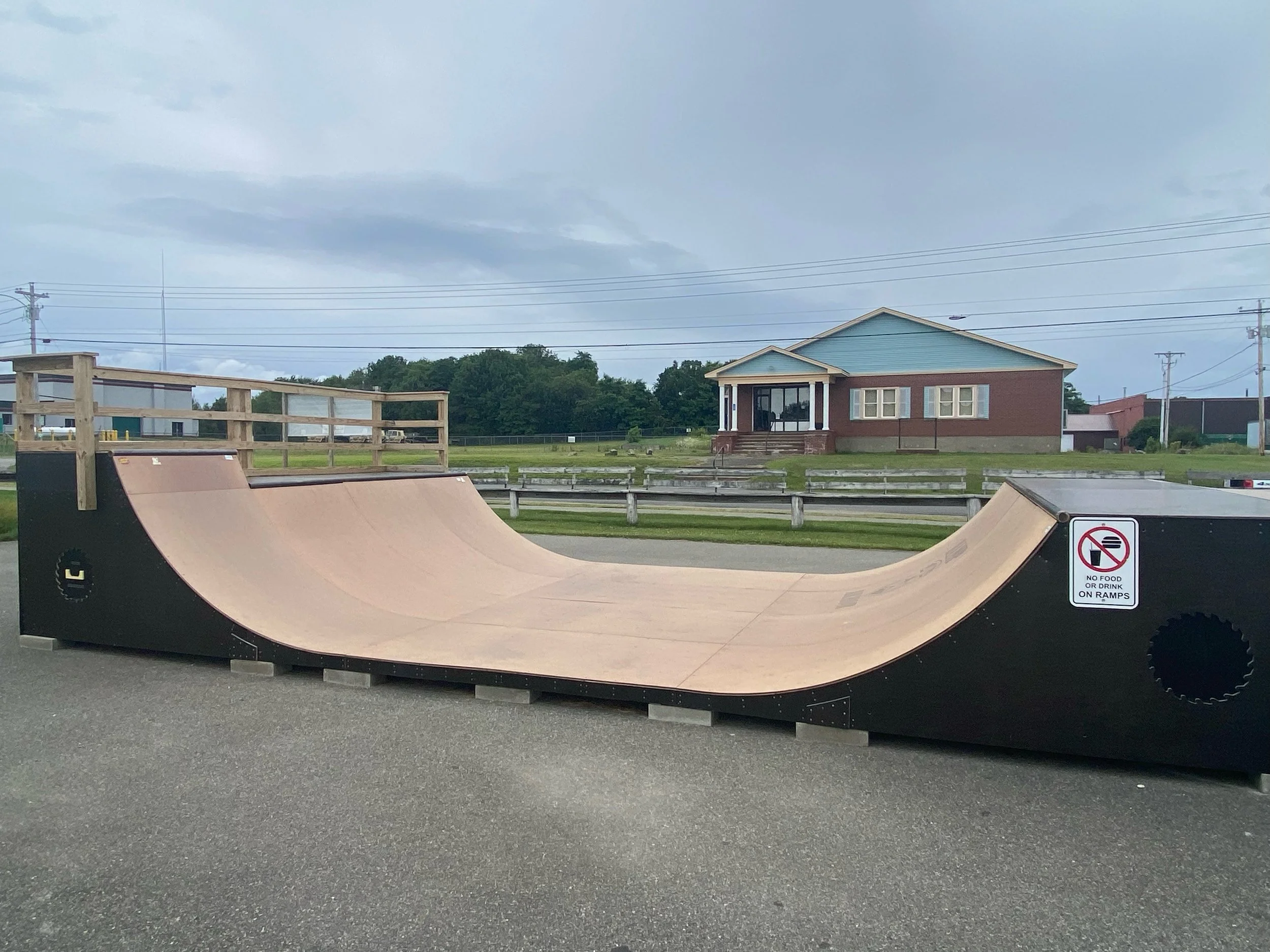 Ramps and Skatelite sheets arrive from Virginia and Connecticut! Perhaps your community rallies for their state championship sports teams as our community does. Our local tradition involves MANY community members who drive to the end of the long road that empties into the outskirts of our town and honk and cheer the arrival of the team, win or lose by the way. So, that’s exactly what the fans of the Calais Skatepark did. We met the flatbed truck which was loaded with the 7 quarter pipes and the lift of Skatelite sheets. We passed by the dumbfounded pedestrians who had no idea about our ‘parade’ all while honking and cheering as we escorted the truck through town and to the skatepark site. Please be it known that, with no names provided, two community employees drove a tractor trailer to Virginia and back through Connecticut to pick up our quarter pipes and Skatelite. They took no money for their time, nor their gas costs! Who does this? Our community is rich with such generosity. Upon arrival, there were probably 30 people there to assist in the unloading and set up of the ramps. While one crew was studying the plans on the laptop and shouting out instructions, another crew was attaching them toget her and integrating them into the ramps that we had designed and built, while another was prepping and serving food and drinks for the workers. What an inspiring community event!